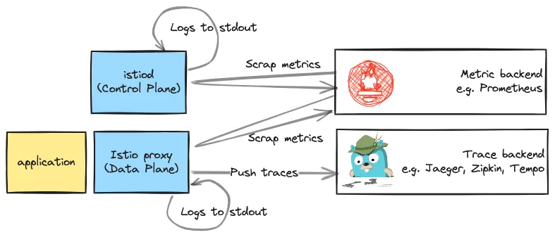 위 그림은 Istio component 종류 별 수집 대상 Observability signal 및 각 signal backend로의 전달 방법을 나타낸다. Metrics는 Prometheus의 수집 방법(scraping; PULL 방식) 그대로를 사용하고, traces는 Istio가 직접 trace backend로 전달하며, Log는 stdout으로 보내어 이후 Fluent-bit 등이 log backend로 보내는 것이 일반적이다.