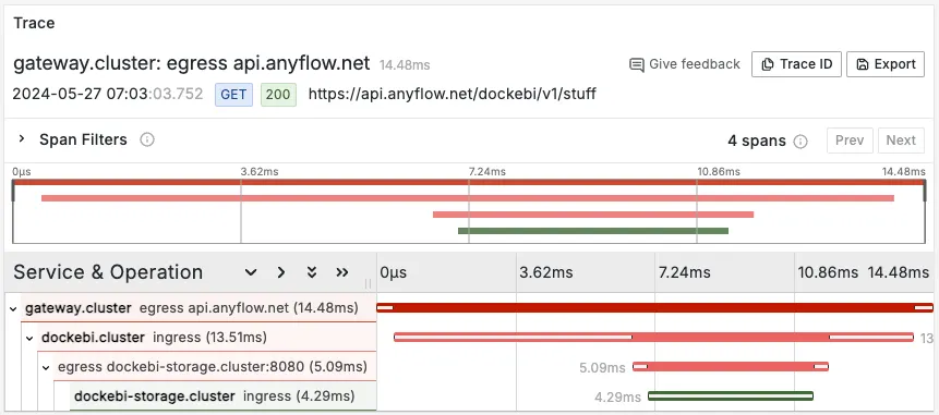 Distributed tracing은 특정 request에 관계된 여러 microservice의 상태를 단일 뷰로 상호 관계지어 확인 가능하게 한다. 아래 그림은 Jaeger를 trace backend로 하여 Istio 기반의 distributed tracing을 구현한 모습으로, 3개의 microservices(gateway, dockebi, dockebi-storage )에 대한 duration 및 상호 관계를 보여주고 있다.