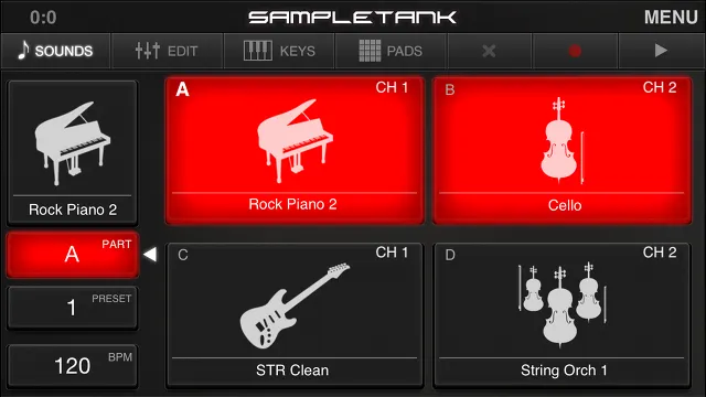 IKMultimedia사의 SampleTank. 이젠 sound module이 아이폰 앱으로 나온다. 대강 악기가 10여개 정도 되는데, 악기 별로 음색이 30여개가 있으니, master keyboard에 이거 하나로 왠간한 소리는 다 해결본다는 뜻. 화면은 Piano와 Cello를 동시에 사용한다는 뜻. 문제는 master keyboard의 MIDI 신호를 아이폰이 받아주어야 한다는 건데, 요 용도로 위 회사에 iRig이란 제품을 팔고 난 그걸 사용하고 있다.