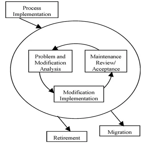 IEEE 12207에서 S/W 유지보수의 주요 활동을 다음과 같이 식별함; 프로세스 구현, 문제 및 수정 분석, 수정 구현, 수정 검토/승인, 이전(migration), 폐기. 이들 활동은 3.2 유지보수 활동에서 다룸.