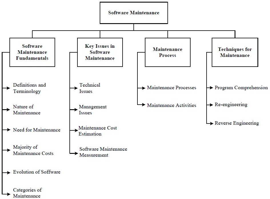 유지보수는 그 자체를 위한 기술 및 관리 이슈를 낳는데, 500K 줄의 코드에서 결함을 찾는 것은 한가지 예. 또한 제한된 자원의 효율적 운용, 다음 배포를 위한 코딩 중의 미래를 위한 배포 계획, 현 배포에 대한 응급 패치 역시 여기에 속함. 이들 사항은 아래 네 개의 토픽으로 정리됨