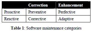 IEEE 14764는 Table 1에서처럼, 적응적/완전적 유지보수를 향상 카테고리로, 교정적/예방적 유지보수를 교정 카테고리로 묶음. 가장 나중에 나타난 예방적 유지보수는 안전성이 중요(critical)할 경우에 종종 수행됨.