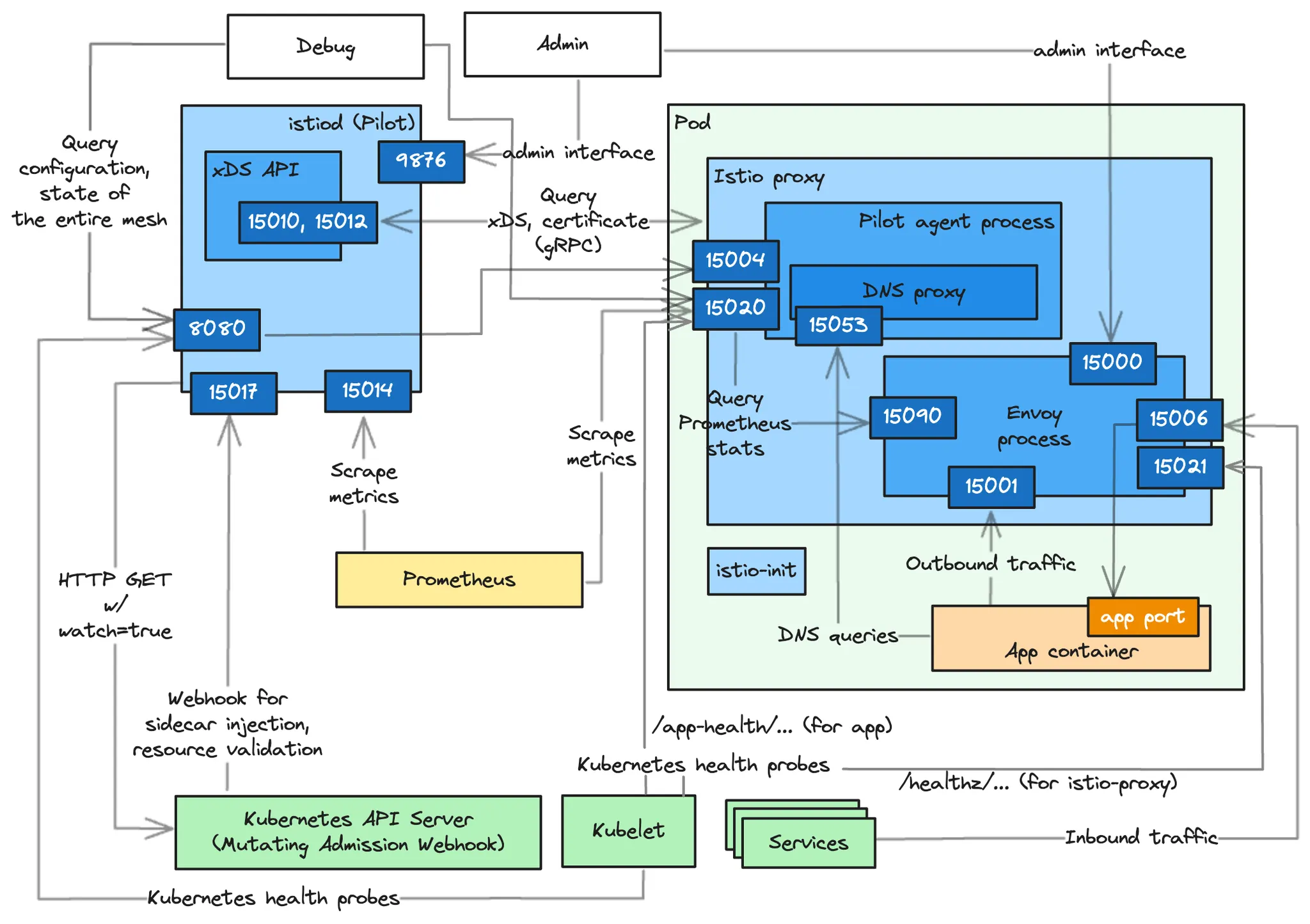 Istio의 control plane으로 Pilot은 이에 대한 옛 이름이다(원래 용도에 따라 control plane은 pilot , citadel, galley 등으로 나뉘었는데 istiod 로 합쳐졌다고). kubectl -n istio-system exec -it deploy/istiod -- netstat -tnl 명령으로 아래와 같은 port 확인이 가능하다.