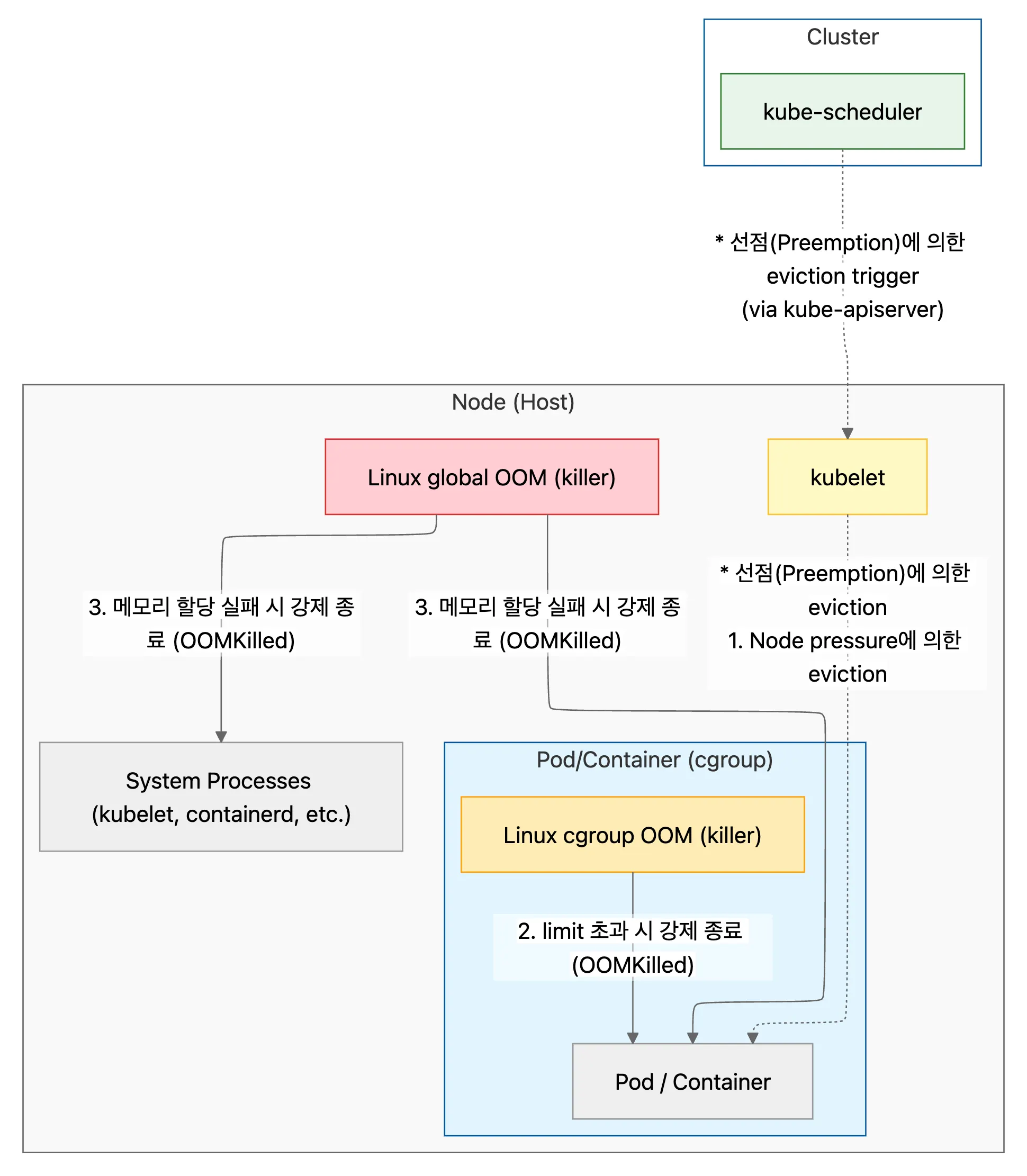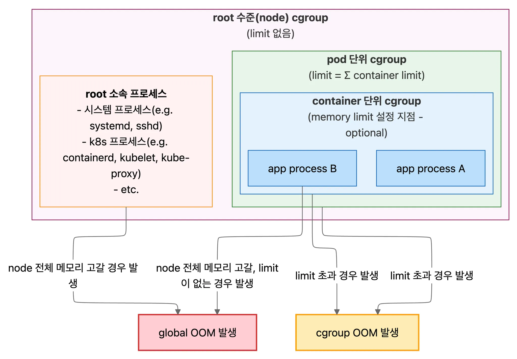 Kubernetes에서 사실 상 모든 프로세스는 cgroup의 통제를 받아 cgroup의 memory controller(memcg)가 cgroup OOM killer이다. 해당 cgroup의 limit 초과 여부가 OOM 발생의 기준이다(limit 설정은 걍 필수라 생각하자).
