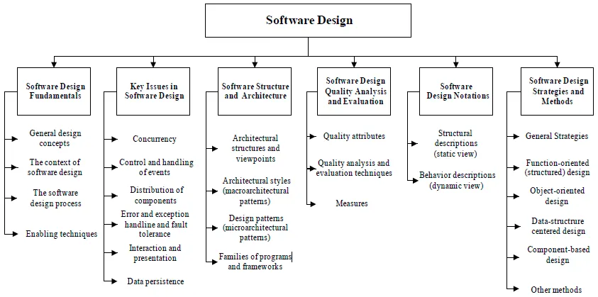 IEEE 610.12-90에 의하면, '설계'란 아키텍처, 컴포넌트, 인터페이스 및 시스템 또는 컴포넌트의 기타 특성을 정의하는 과정과 해당 과정의 결과임. 프로세스 관점에서 보면, S/W 설계는 작성(construction)의 기반이 되는 S/W 내부 구조에 대한 기술을 얻기 위해 요구사항을 분석하는 SWE 생명주기 활동임. S/W 설계는 컴포넌트로 분해되고 조직화된 방법을 기술한 S/W 아키텍처와 이들 컴포넌트간의 interface를 기술하며, 이는 실제 작성이 가능한 수준의 세밀도로 표현되어야 함.