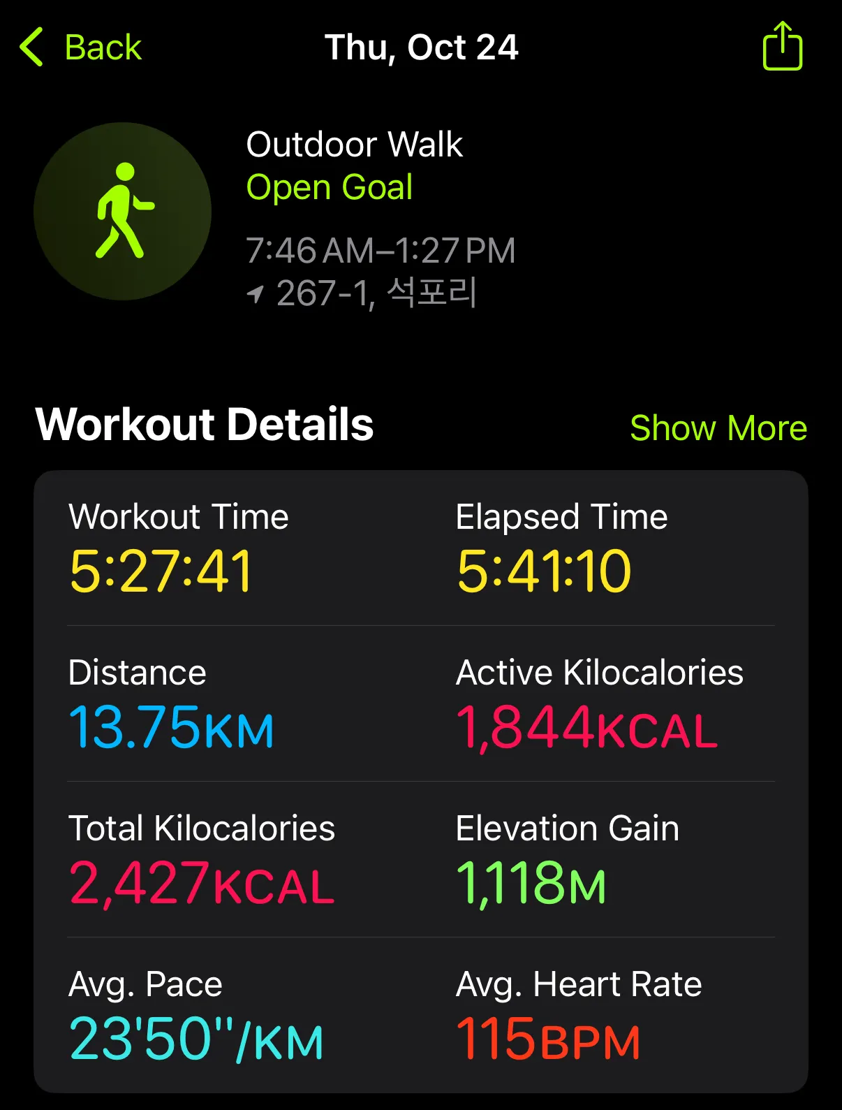 얼추 5시간 반 동안 중간 식사 없이 움직인건데, 하루가 지난 현재 다리 전체에 알이 제대로 배겼다. 움직이기 넘 힘들다.