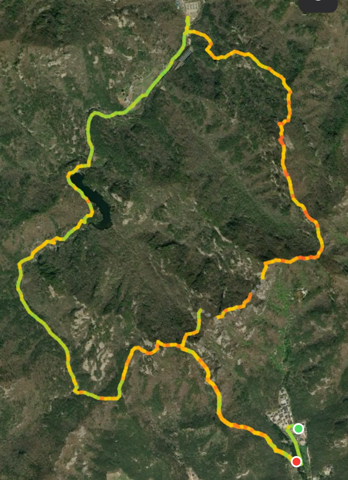 초록점이 출발, 붉은점이 종료 지점. 이들 점이 위치한 허였고 자그만 평지가 내소사다. 꽤 많이 걸었다는 뜻.