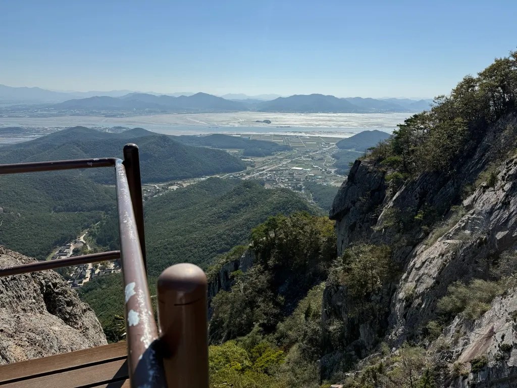 관음봉에서 보이는 변산반도 해안가. 누가 서해안 아니랄까봐 죄다 뻘이다. 좌하단 바위 위로 내소사가 보이는데 아쉽게도 난간에 가렸다.