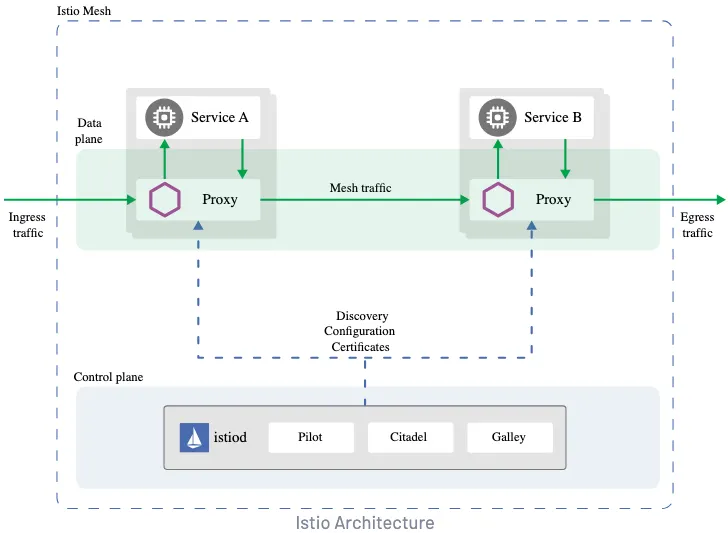 Istio 아키텍처. 이미지 출처 : https://istio.io/latest/docs/ops/deployment/architecture/