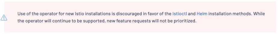 k8s custom resource를 사용하여 application을 관리하는 방법으로, istio의 IstioOperator 란 resource를 사용하여 설치하는 방법이나, istio 공식 사이트에서는 추천하지 않는다(신규 기능에 대해 우선 순위에서 앞선 방법 대비 밀린다고)