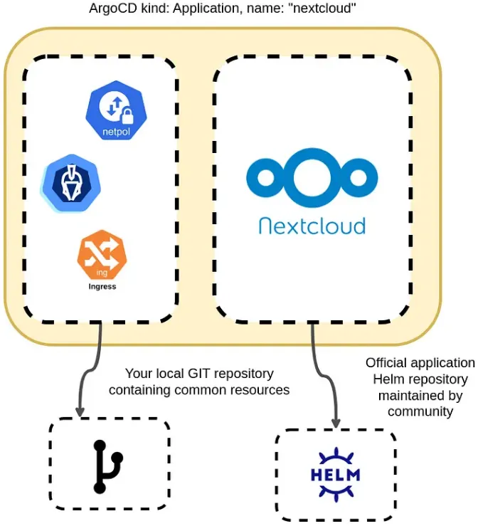 argoCD는 multiple source를 지원함으로, helm chart는 외부의 공식 chart와 values.yaml 의 repo를 분리하여 이들 모두를 사용 가능함.