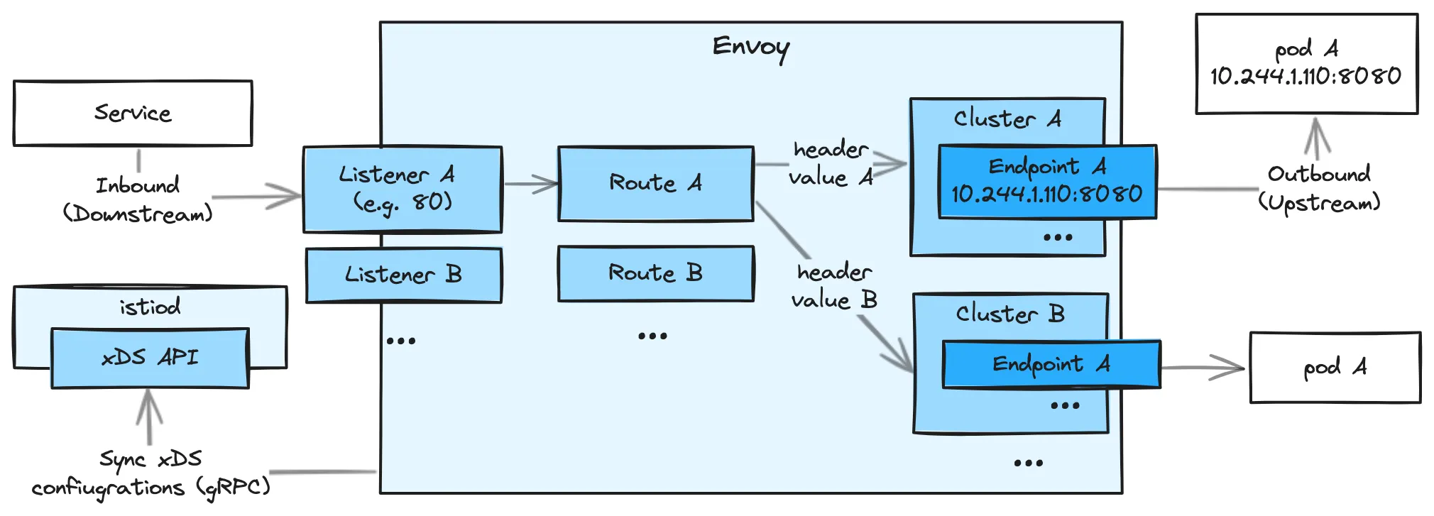 xDS는 eXtensible Discovery Services의 약자로 dynamic configuration 관리 서버, 즉 istiod 가 노출하는 API 및 이들 서비스를 가리킨다. Envoy는 istiod 를 ‘구독’하여 최종적 일관성(eventual consistency)에 기반하여 configuration을 상시 동기화한다(출처). 참고로 이 동기화에는 Istio의 경우 gRPC를 사용하는데, Envoy는 이외에도 HTTP long polling과 특정 filesystem watch 기법도 제공한다고.