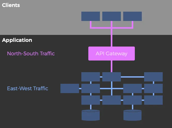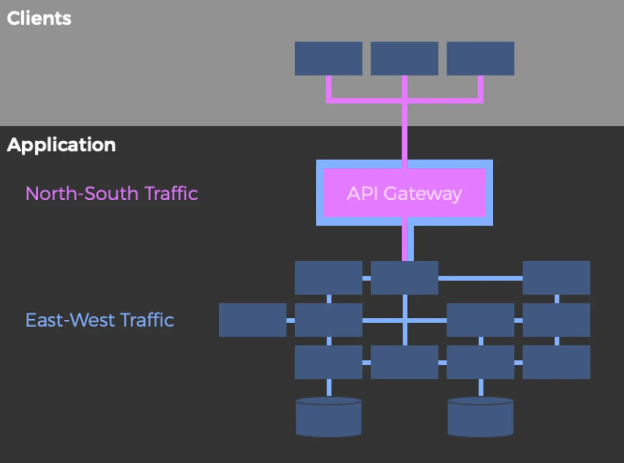 이들 두 용어 관점에서 보자면 API Gateway는 Noth-South traffic를 다루는 모듈이다. 이 traffic은 API Gateway를 이후로 끝나거나(API Gateway에 연결된 worload에서 처리가 끝나는 경우), East-West traffic으로 전환된다(API Gateway에 연결된 service가 타 worload를 호출하는 경우).