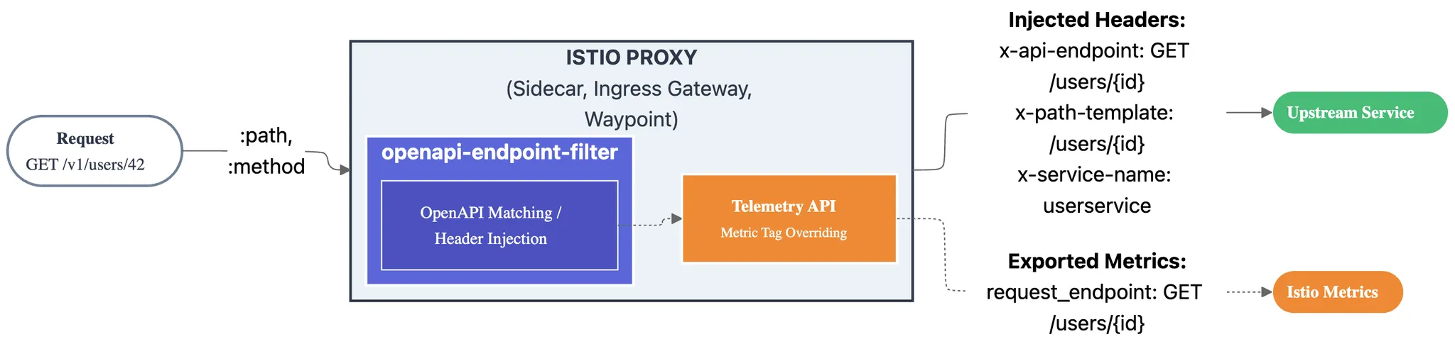 openapi-endpoint-filter 동작 구조. API 식별자(예: /users/{id})를 request header와 Istio metric label로 삽입한다.