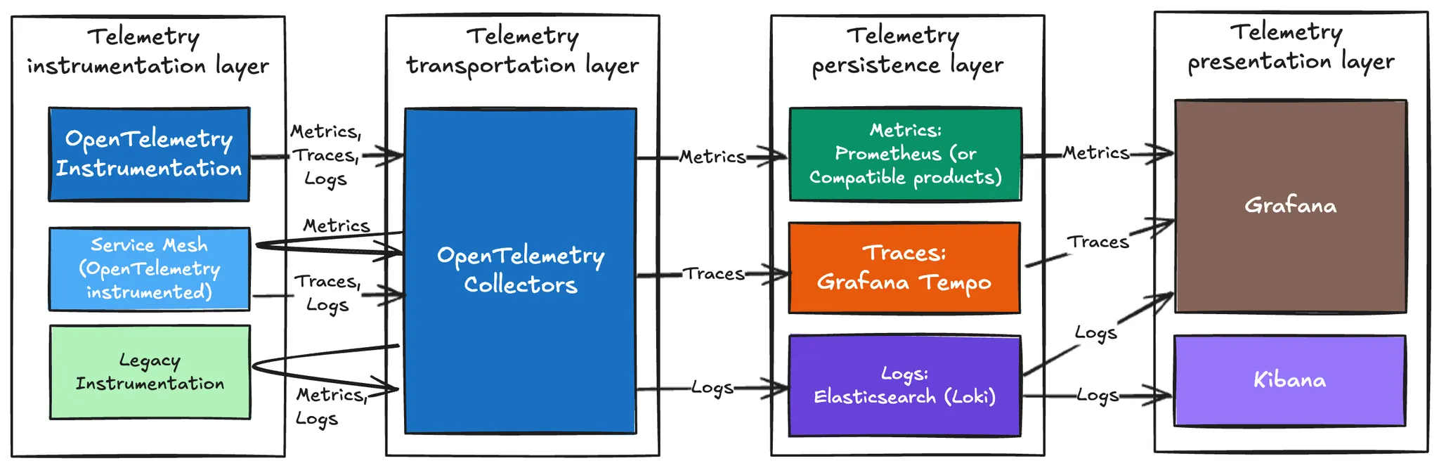 본 글 맨 앞에 위치한 Open source 기반 Observability architecture 그림에 대한 상세 설명이다. Telemetry의 lifecycle을 따라 계측(instrumentation), 전송(transportation), 저장(persistence), 조회(presentation)으로 계층을 나누었다.