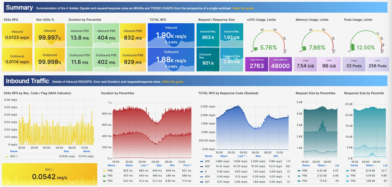 본 아키텍처를 통해 자체 구현된 4 SRE Golden Signals(latency, traffic, errors, saturation)를 나타내는 Grafana Dashboard