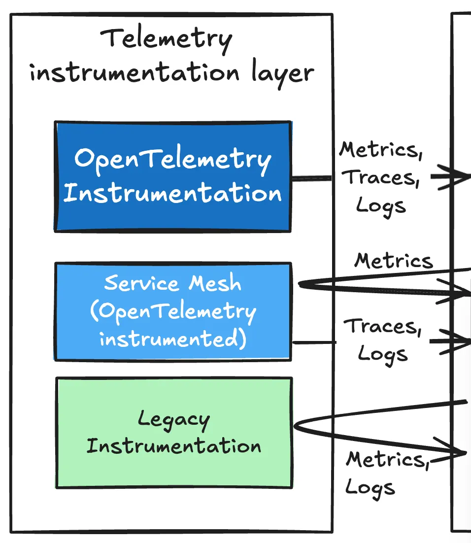 Legacy instrumentation: 상기 두 가지에서 측정되지 않는 telemetry는 그대로 두어 OpenTelemetry Collector가 직접 수집하도록 하게 한다. 대표적 예로, 다양한 Prometheus 기반의 exporters와 file system에 위치하는 log가 있다(Trace는 앞선 두 가지 instrumentation 구현체에서 다룬다).