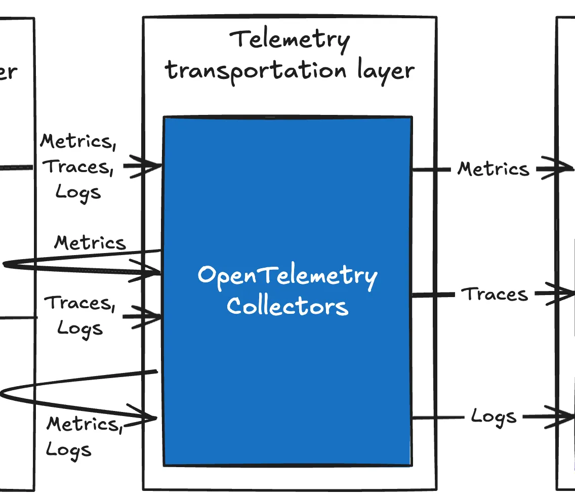 전송 layer는 OpenTelemetry Collectors로 일원화 가능하다. 시장에서 사용되는 대부분(?)의 instrumentation 대해 OpenTelemetry가 receiver로 지원하기 때문. Telemetry 별 OpenTelemetry Collector 분류에 대해서는
