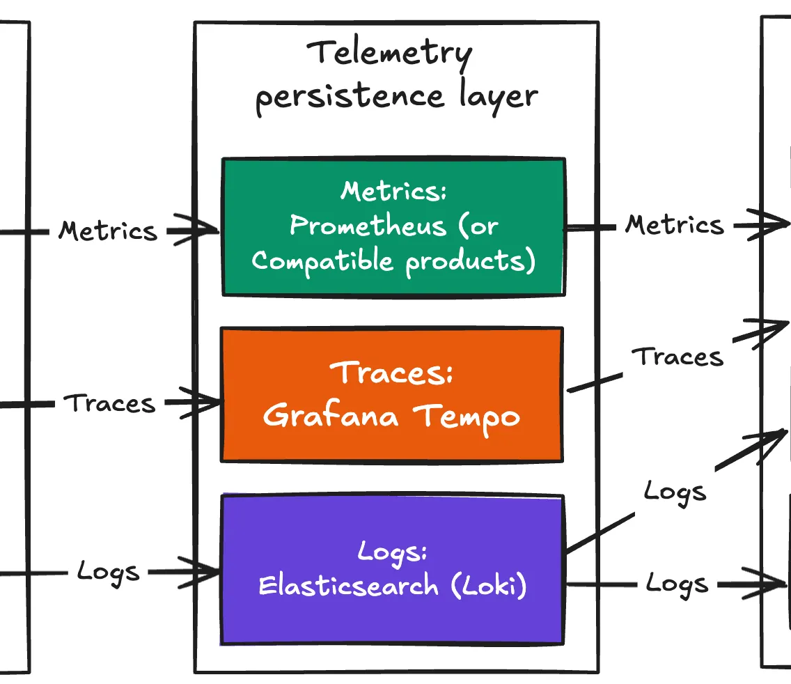 Telemetry의 영속적 저장과 함께 Presentation 계층을 위한 telemetry 조회용 engine을 제공하는 계층이다. 본 계층에서 telemetry의 종류(metric, log, trace) 별로 component가 나뉜다. 아래 논한 모든 component는 당연스럽게도 Open Source이자 OpenTelemetry를 지원한다.