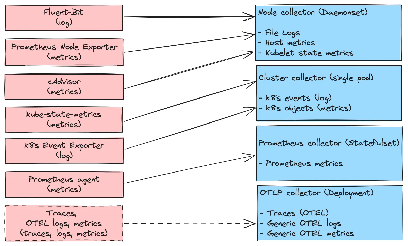 이 경우 아래 분류의 mapping diagram에서는 Node Collector가 Prometheus, OTLP collector의 역할을 겸하게 되고, observablity backends로의 signal 전달 전용의 gateway collector가 추가되겠다.