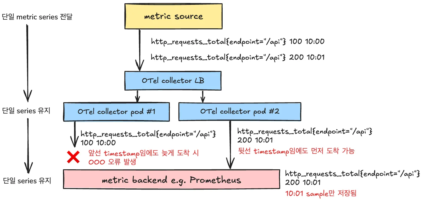 OpenTelemetry Collector는 HA 및 scaling을 위해 다수의 instance 구성을 지원하며(gateway 모드), 이 구성은 필연적으로 metric sample의 순서 역전을 유발한다.