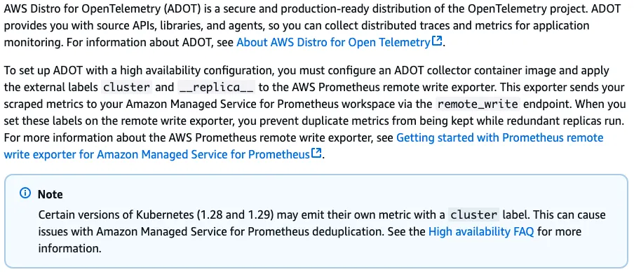 AMP는 OTel Collector 사용 시, __replica__ 이름으로 위와 동일한 방법으로 추가하라는 가이드를 하는데(OTel Amazon 배포판 기준을 논하지만 마찬가지이다), 이는 사실 상 잘못된 설명이다. 이에 대한 자세한 내용은 Appendix: Cortex 계열 제품에서의 __replica__ pod 식별자에 관하여를 참고한다.