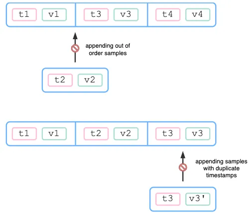 중도 삽입 또는 동일 timestamp 삽입 거부를 나타내는 그림. 출처: https://promlabs.com/blog/2022/12/15/understanding-duplicate-samples-and-out-of-order-timestamp-errors-in-prometheus/