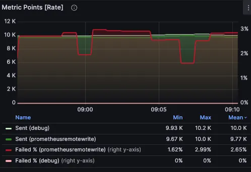otelcol_exporter_send_failed_requests 메트릭 예(붉은 색. 약 3%의 오류를 보여주고 있음)
