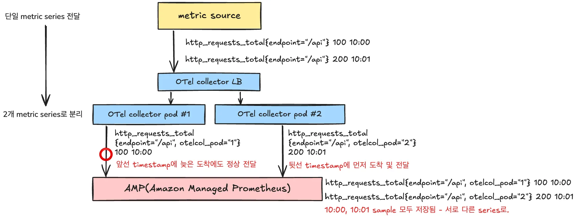 out_of_order_time_windw 옵션을 지원하지 않는 AMP에서는 OTel collector에서 각 metric에 collector 자신의 식별자를 붙이는 방법으로 해결 가능하다. 이는 OOO 오류의 발생 조건인 ‘동일 metric series’을 피하는 전략으로, 이 식별자를 붙임으로 각 metric series는 식별자 갯수 만큼 series로 나뉘게 됨으로 자연스럽게 OOO 오류를 피하게 된다(동일 collector pod를 거치는 모든 metric은 처리된 sample간 순서가 보장됨을 전제로 한다).