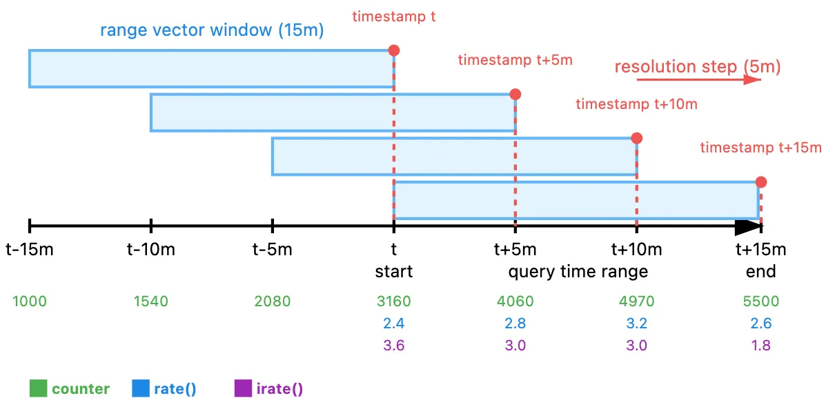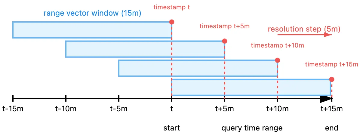 계산은 일종의 sliding window 방식으로, resolution step에 따른 각 timestamp에 맞게 range vector의 위치가 정해져 각 window 별로 계산을 이룬다. 각 계산 결과의 타입은 각 timestamp 기준의 instant vector가 되고, 이들 instant vector를 모은 결과로 최종 output인 range vector가 만들어진다.