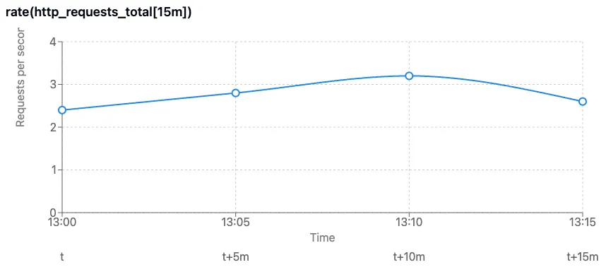 예를 들어 설명한다. 위 그래프는 20분간(13:00 ~ 13:15)의 RPS에 대한 time series를 나타내어, 값 간의 간격은 5분이다. 이 그래프를 그리기 위한 Prometheus로의 질의 방법은?