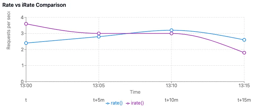 spike를 잘 잡는 특성, 변동성이 크고 빠르게 움직이는 카운터이란 irate() 용도는 두 인접 sample 간 value 차이를 그대로 반영한다는 점, 즉 average의 평탄화 효과가 없다는 점에서 이해 가능하다. 또한, 두 sample 이외의 나머지 sample의 값 및 범위가 무시되는 irate() 동작 특성은 드문 스파이크로만 구성된 그래프를 읽기 어렵다는 점과 짧은 query time range에서 사용이 필요하다는 점의 원인으로 이해된다(query time range가 클 수록 무시되는 sample 수가 증가한다).