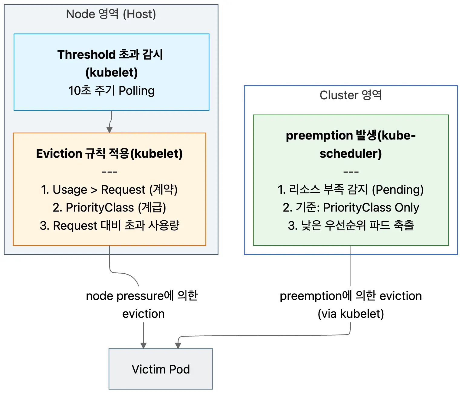 Pod eviction을 발생시키는 경우는 여럿이지만 preemption과 node pressure 상황이 대표적으로, 전자는 신규 pod를 위한 남은 node resource가 모자라 기존 pod가 eviction되는 경우를, 후자는 pods의 resource 과다 사용으로 인해 OS가 할당 가능 resource를 확보하려는 경우를 의미한다.