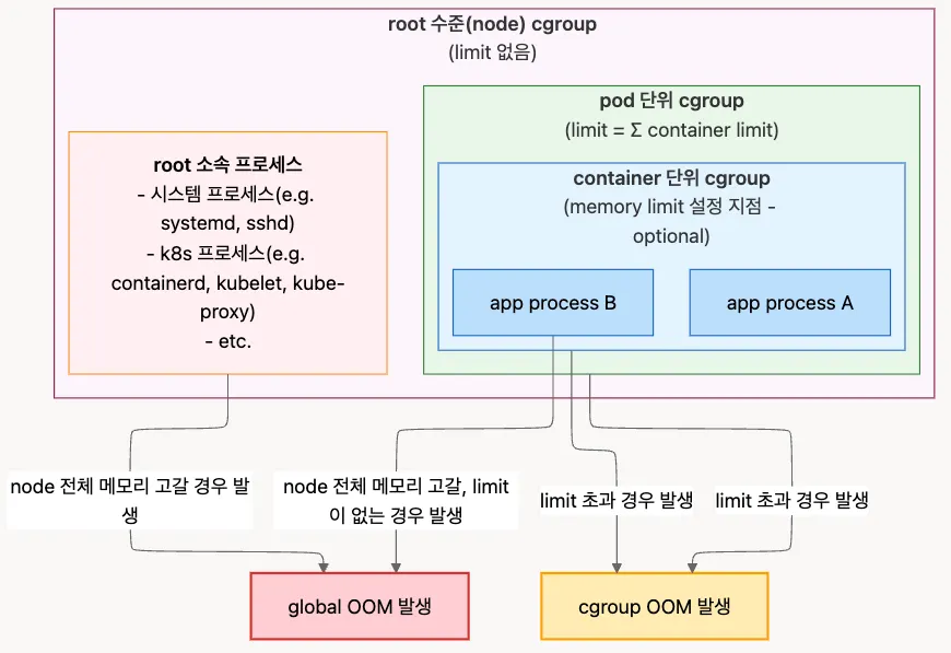 Kubernetes에서 사실 상 모든 프로세스는 cgroup의 통제를 받아 cgroup의 memory controller(memcg)가 cgroup OOM killer이다. 해당 cgroup의 limit 초과 여부가 OOM 발생의 기준이다(limit 설정은 걍 필수라 생각하자).