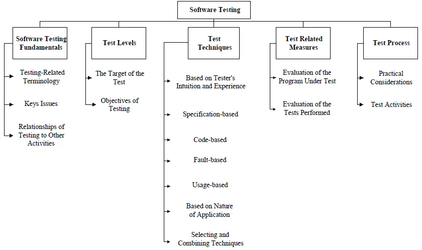 결함 유형, 분류, 통계(Fault types, classification, and statistics) : 어떤 유형의 결함이 시험 중 발견되는지 및 이전에 발생했던 결함에 비한 상대적 회수를 아는 것이 중요하여, 이를 통해 품질 예측 및 공정 향상(process improvement)를 이룰 수 있음. S/W 품질 KA의 3.2 결함 특성화 참조.