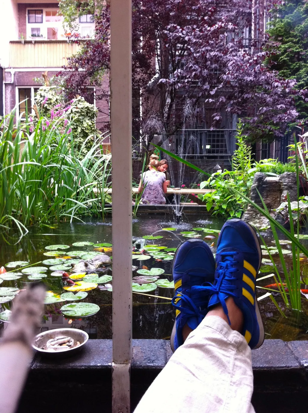 Amsterdam의 Hostel 정원에서 식후 땡을 즐기면서. 이 Hostel은 기독교에서 운영하는 건데, 아이러니하게도 이 건물 바로 옆에는 정육점 불빛이 쫙 펼쳐져 있다. 맞다. 여기가 바로 de wallen, 그 유명한 홍등가(red light district)이다.
