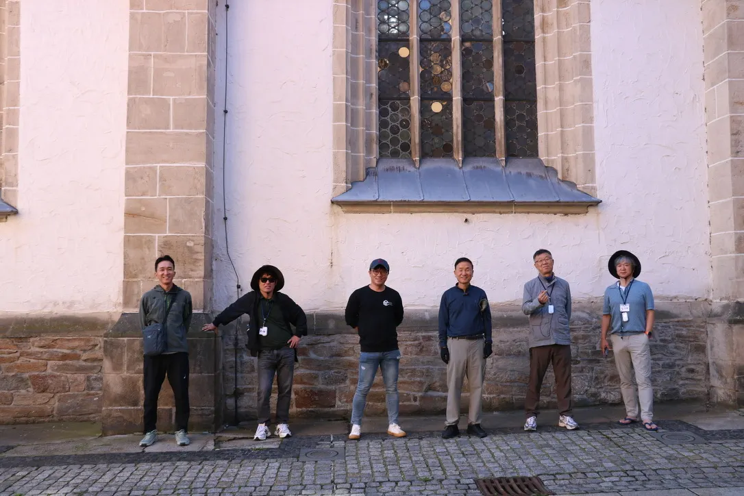프라이베르크 도시 및 광산 박물관 정면에 위치한 프라이베르크 대성당(Dom St. Marien)을 뒤로하고 한 컷. 박문호 박사님과 라이프치히에서의 술 멤버 및 버스와 식사 시간에 이 탐사와 과학 관련 여러 의견을 나누었던 일행 분과 함께. 검정 옷 입길 잘했다. 똥배가 안보인다. 박사님의 사모님 작품.