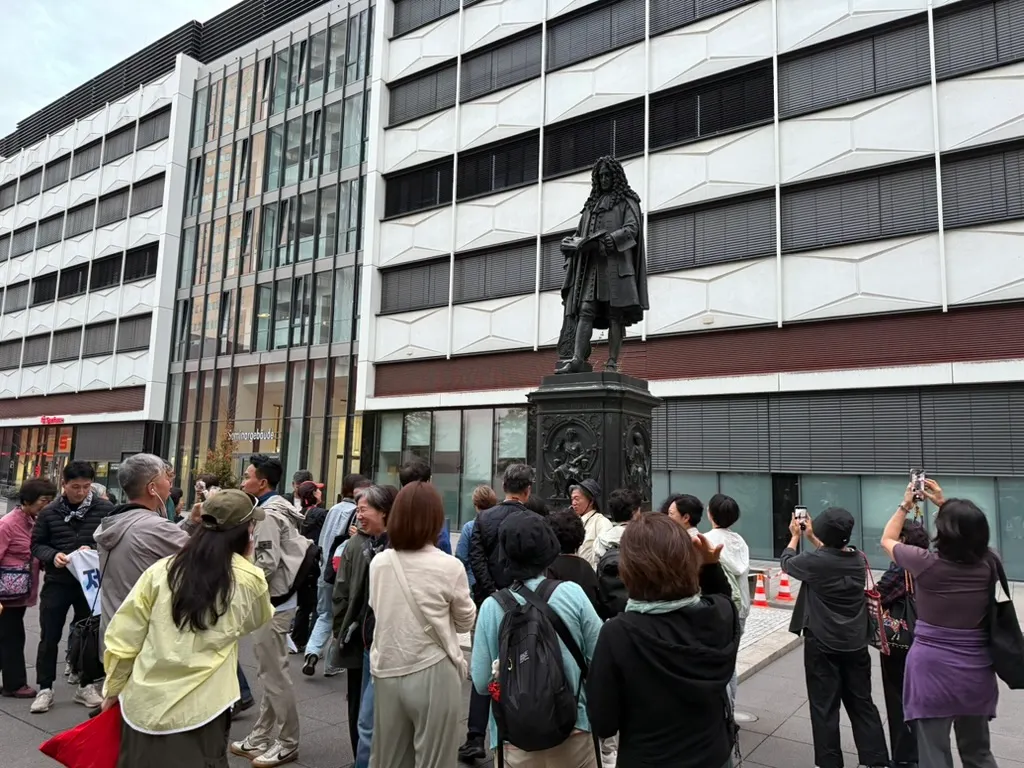 대망을 이루어냈으니 이제 라이프치히를 떠나도 전혀 문제될 것이 없다… 는 내 생각이고, 그 옆의 성 니콜라이 교회에서 가이드가 독일 통일 관련 역사적 이벤트에 관한 썰을 풀더니 왠 골목으로 이끈다. 이어 건물에 둘러싸인 작은 광장 정면 중앙에 왠 동상이 있다. 고트프리트 빌헬름 라이프니츠(Gottfried Wilhelm Leibniz)의 동상이라고. 그리고 여기가 라이프치히 대학교라 한다.