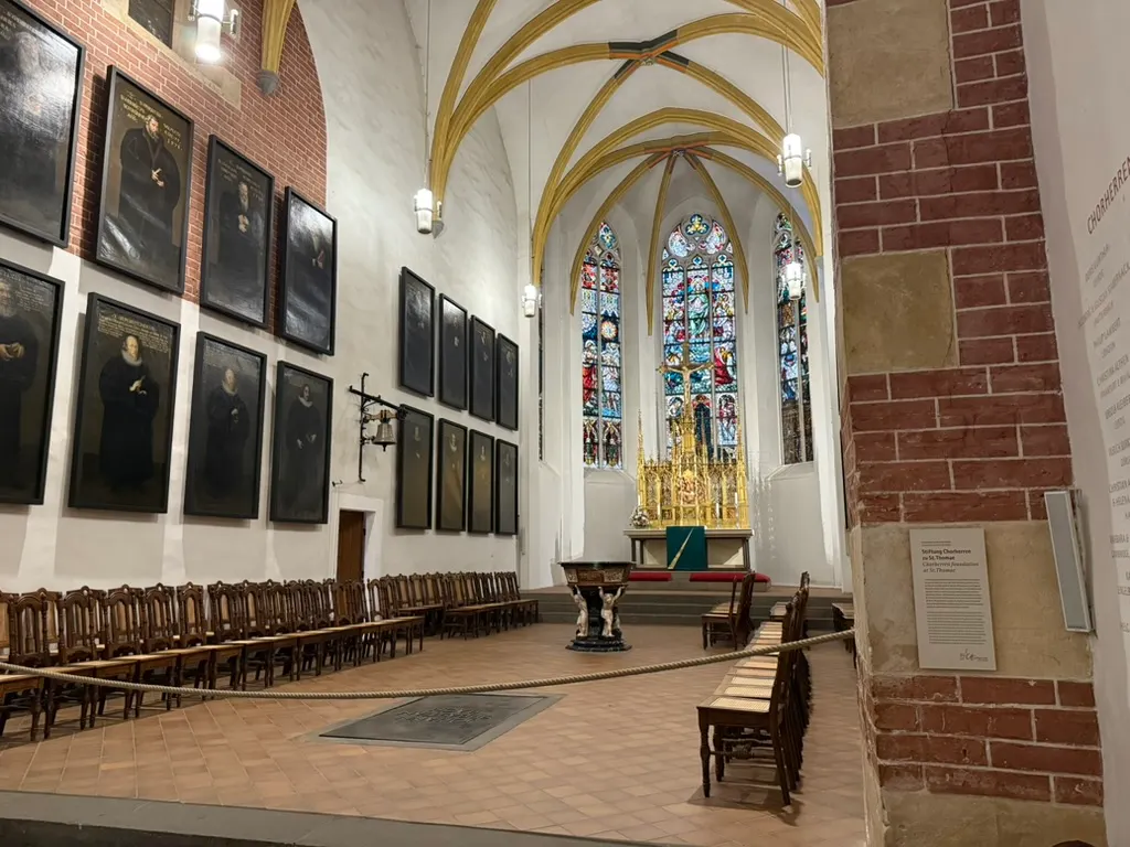 성 토마스 교회 내부. 바닥의 철판은 이곳에 바흐가 묻혀있음을 나타낸다. 화려한 스테인글래스와 예수가 매달린 십자고상은 같은 개신교임에도 울나라의 그 것과 루터교가 얼머나 다른지를 상징한다. 카톨릭 성당과 다를게 전혀 없다.