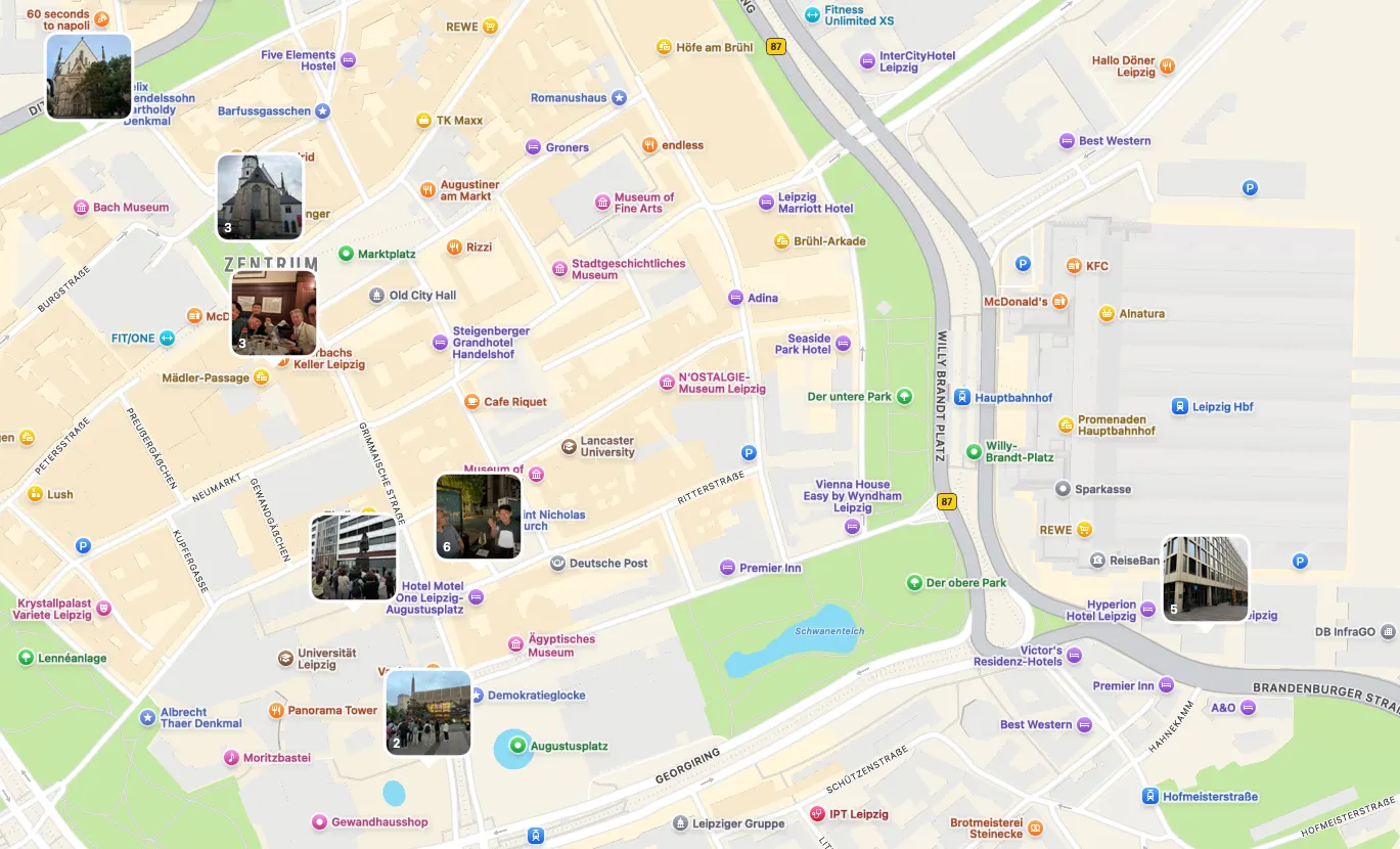 라이프치히에서의 발자취. 오른쪽 끝이 머문 호텔의 위치, 좌측 끝이 성 토마스 교회로 끽해야 도보로 20분 내외면 갈 수 있는 짧은 거리이다. 꽤나 지도를 확대해서 그렇지, 라이프치히의 극히 일부만 다닌 셈이다. 가장 밑의 사진이 아우구스투스 광장, 바로 윗 사진이 라이프치히 대학교.