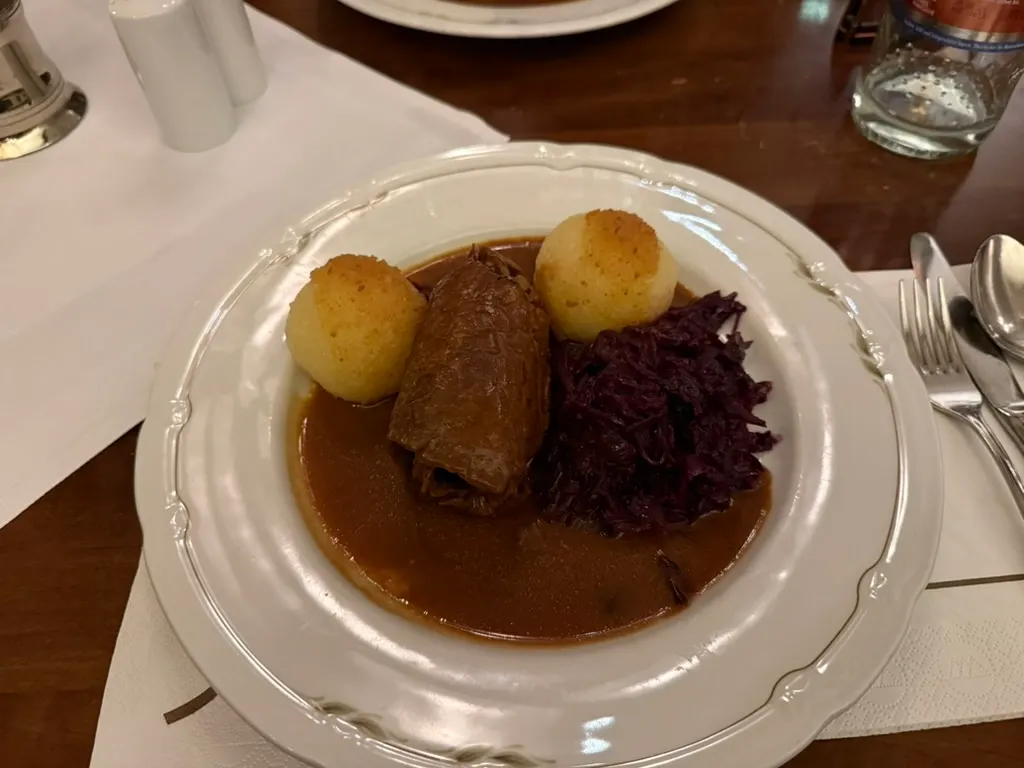 저녁 식사였던 고기는 롤라데(Roulade)라 불린다고. 얇게 썬 소고기에 베이컨, 양파, 피클 등을 넣고 둘둘 말아 육수에 끓인 음식이라 Gemini AI가 전한다. 여하간 짜서 거의 대부분을 남겼다.