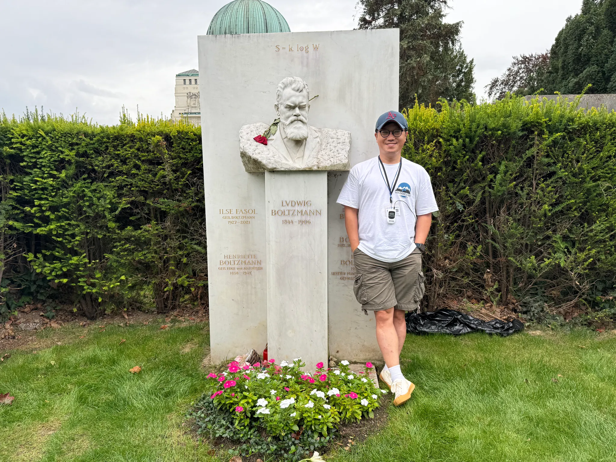 볼츠만 묘비석 앞에서. 물리학에서나 S/W Engineering에서나 엔트로피의 중요성을 고려하자면, 볼츠만 묘비석 방문은 내게 큰 의미를 갖는다. 문제는 이 비석 정면에 떡하니 이동식 화장실이 놓여 비석을 가로막고 있었다는 거. 아니 오스트리아 사람들 재정신인가? 인류사에 손꼽히는 발견을 이룬 위인을 이따위로 취급하는 게 말이 되냐는 뜻이다.