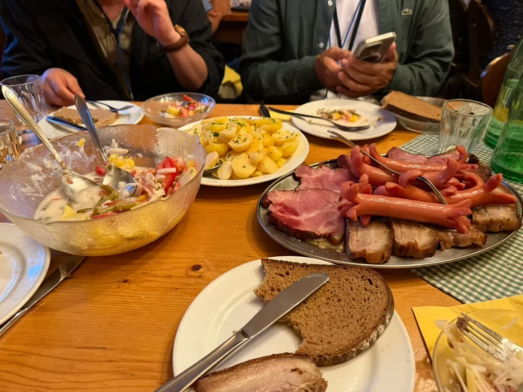 여기까지가 이 도시에 도착하자마자의 행보이고, 저녁 먹으러 Alter Bach-Hengl란 이름의 오스트리아 전통 선술집/식당에 갔는데 300년 이상된 곳이라고. 헌데 어찌나 음식이 짜던지… 아래 사진에도 보이듯 전형적인 서양식 음식인데, 개인적으로 서양식, 특히 소시지 등 고기류를 좋아라 함에도 몇점 집어 먹다 말았다. 가이드 왈, 유럽 음식은 원래 짜다고 하지만 정작 윗동네로 가선 별로 그걸 못 느꼈다. 이 선술집이 와인으로 유명하다던데 정작 와인이 주문안된 건 함정. 이는 아마도 술을 못드시는 박사님 성향에 비롯된 듯 하다.