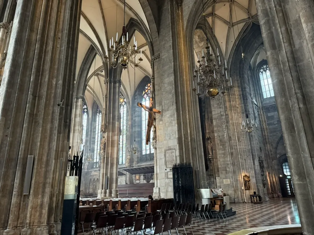 슈테판 대성당 내의 십자고상. 중앙 홀 중간에 매달린 모습이 뭔가 으스스함을 자아낸다. 어쨌건 슈테판 대성당은 합스부르크의 루돌프 4세 주도로 만들어졌다는데, 그는 오스트리아를 국력, 위상을 끌어올리고 빈을 문화, 정치 중심지로 만든 대공(Archduke)이라고.