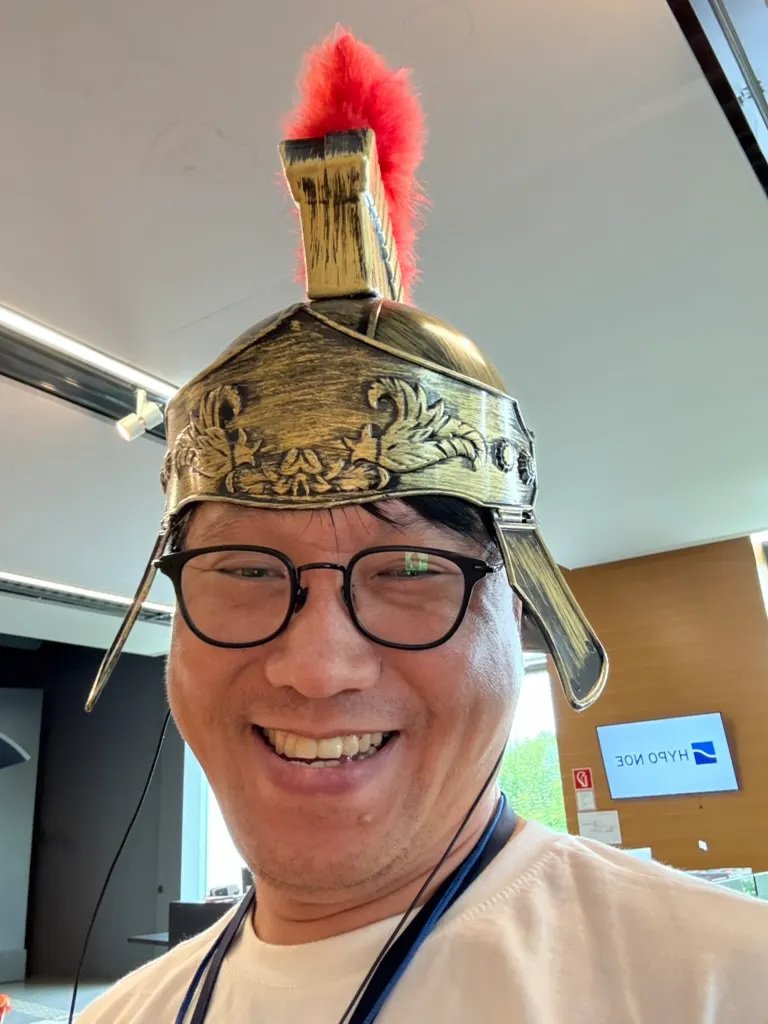로마군 투구 모형을 쓰고 놀고 있는 나. 난 벌써 이 시점부터 이러고 따로 놀고 있었다. 대부분의 다른 탐사 대원은 박사님을 따라 열심히 강의 듣고 있는 와중에. 카르눈툼 기념품 샵에서.